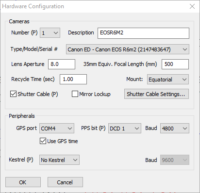 Starten Sie anschließend Eclipse Orchestrator und wählen Sie Ihre Kamera im Menü „Setup“ → „Hardware Configuration“ aus. Tragen Sie dort die Blendenöffnung („Lens Aperture“) und die Brennweite („Focal Length“) der verwendeten Optik ein. Im Feld „Description“ können Sie Ihrer Kamera einen frei wählbaren Namen zuweisen.