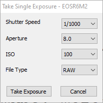Nach einem Neustart von Eclipse Orchestrator sollte die Kamera bereits fernsteuerbar sein. Überprüfen Sie dies über das Menü „Camera“ → „Push Shutter“ bzw. „Take Single Exposure“.