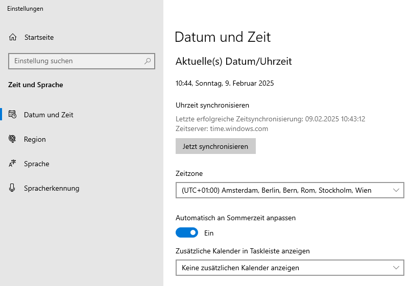 - Erste Zeile: Datum und aktuelle UTC-Zeit, rechts daneben der PPS-Status (falls unterstützt) sowie die Differenz zwischen der PC-Systemzeit und der GPS-Zeit („ClkErr“). Idealerweise beträgt dieser Wert 0 Sekunden. Hinweis: Falls der Wert von 0 abweicht, klicken Sie in den Windows-Einstellungen unter „Datum und Uhrzeit“ auf „Jetzt synchronisieren“. Die Synchronisierung kann einige Minuten in Anspruch nehmen.