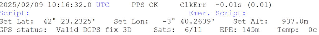 - Vierte Zeile: GPS-Status, die Anzahl der erfassten Satelliten, die Genauigkeit in Metern (EPE) sowie – sofern verfügbar – die gemessene Temperatur in Grad Celsius.