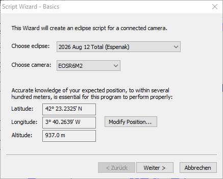 Wichtiger Hinweis: Die Koordinaten bestimmen die Finsternisdauer und damit sämtliche zeitlichen Parameter im Skript. Bei einer Standortänderung (und damit veränderter Finsternisdauer) sollte ein neues, angepasstes Skript erstellt werden. Andernfalls kann es zu zeitlichen Überschneidungen kommen – was zu ausgelassenen Auslösungen, falschen Belichtungen oder gar einer blockierten Kamera führen kann.