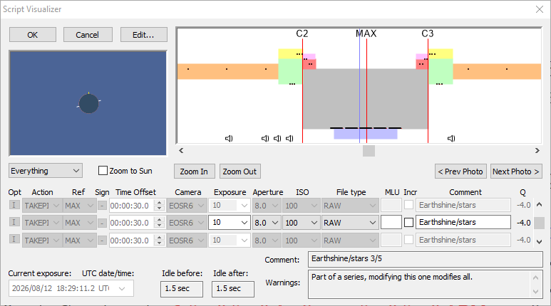 Gerade bei sehr kurzen Totalitätsdauern – wie am 12. August 2026 mit nur etwa 100 Sekunden – sind fünf Langzeitbelichtungen für den Earthshine deutlich zu viel. Dadurch bleibt nicht ausreichend Zeit für die Belichtungsreihe der Korona.