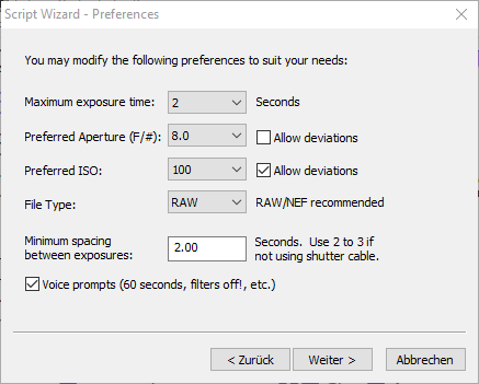 Wenn sich die Blende des Kameraobjektivs über die Kamera steuern lässt, können Sie im Script Wizard ein Häkchen bei „Preferred Aperture“ im Feld „Allow Deviations“ setzen. In diesem Fall passt Eclipse Orchestrator die Blendenzahl im Skript automatisch an, um sicherzustellen, dass die Belichtungszeit stets unter dem angegebenen Wert von 2 Sekunden bleibt.