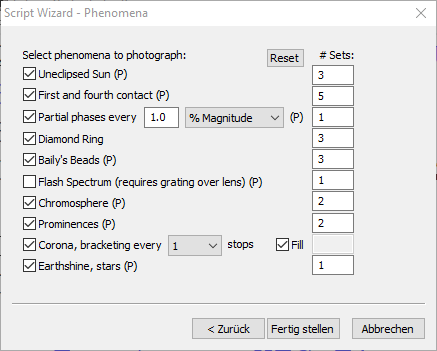 Im dritten Schritt wählen Sie die gewünschten Finsternisphasen und die Anzahl der Aufnahmen pro Phase („Sets“) aus.