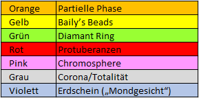 Rechts oben: Zeitstrahl mit farblich markierten Finsternisphasen