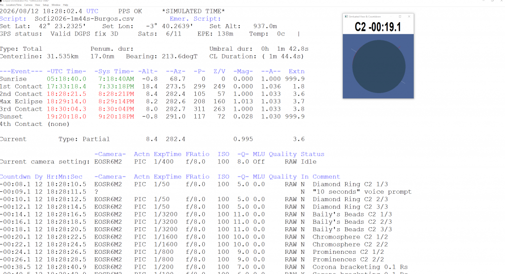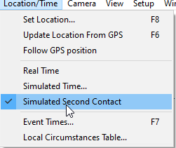 Im Menü „Location/Time“ → „Simulated Time“ können Sie einen beliebigen Zeitpunkt festlegen oder direkt mit „Simulated Second Contact“ beim zweiten Kontakt der Finsternis starten.