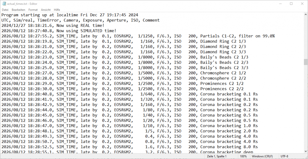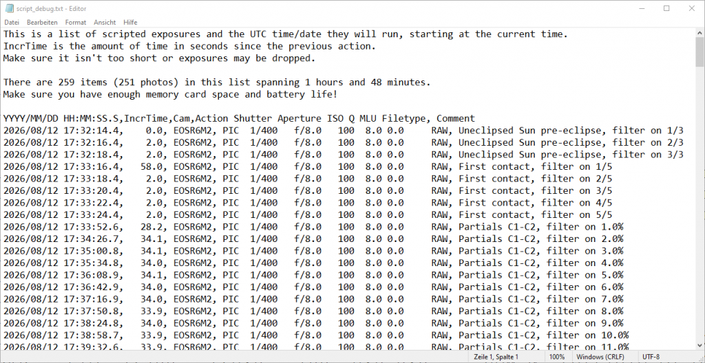 Über „File“ → „View Exposure Sequence“ können Sie die erstellte Sequenzdatei (script_debug.txt) anzeigen und mit den tatsächlich auf der Speicherkarte gespeicherten Fotos vergleichen.